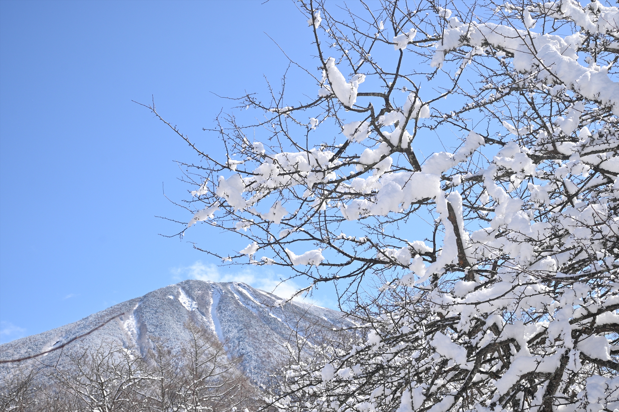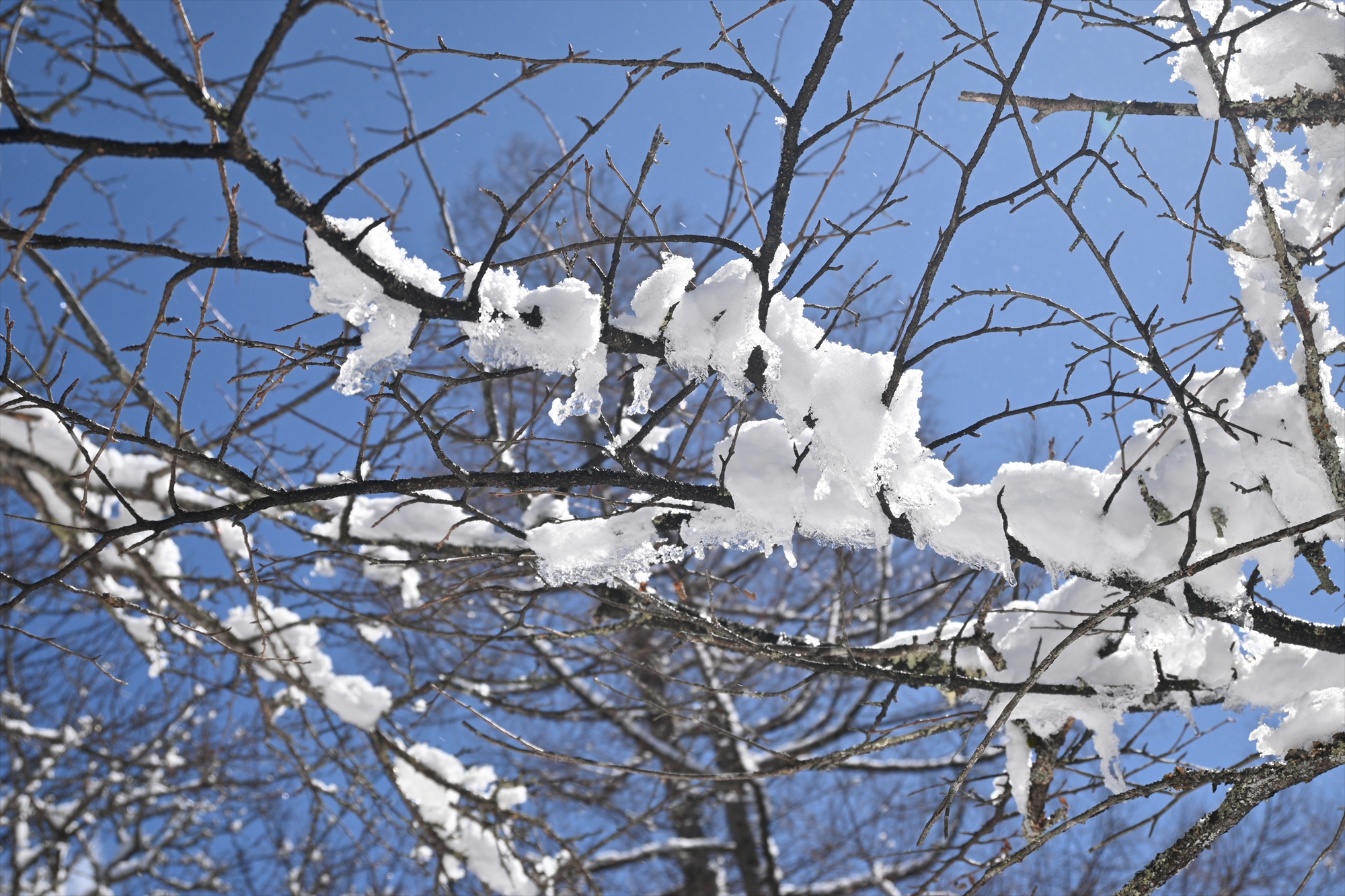 理由は雪の質の違いです。奥日光の厳冬期に降る雪は、日本海側の多雪地域で湿った雪を沢山降らせた後、水分が少なくなった雪雲がもたらすもので、降っても枝先にはくっつかない乾いたパウダースノーになります。