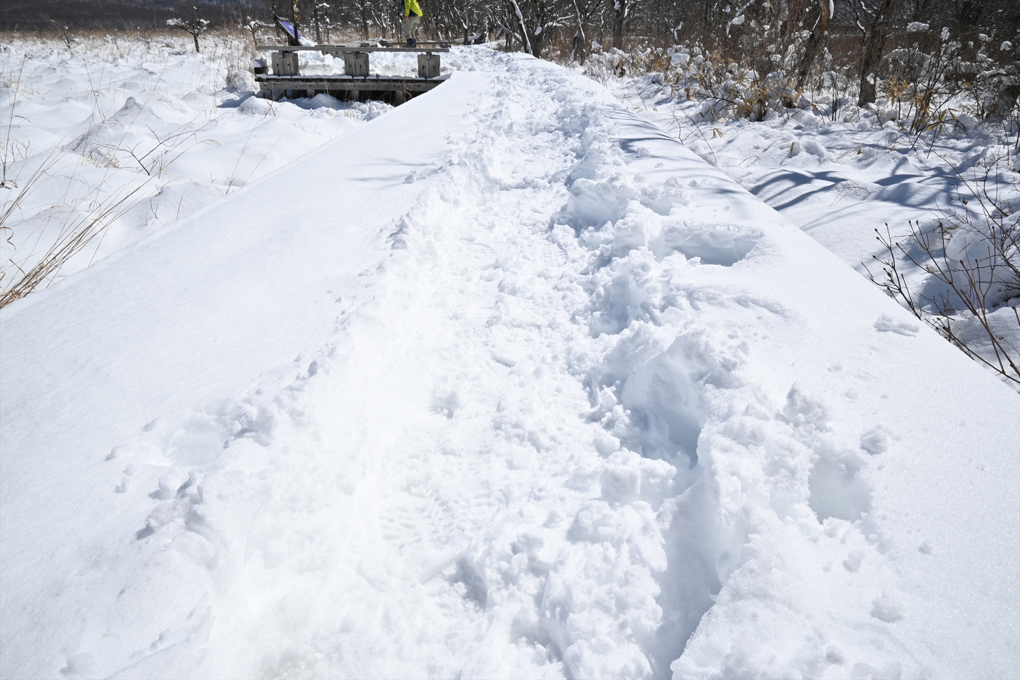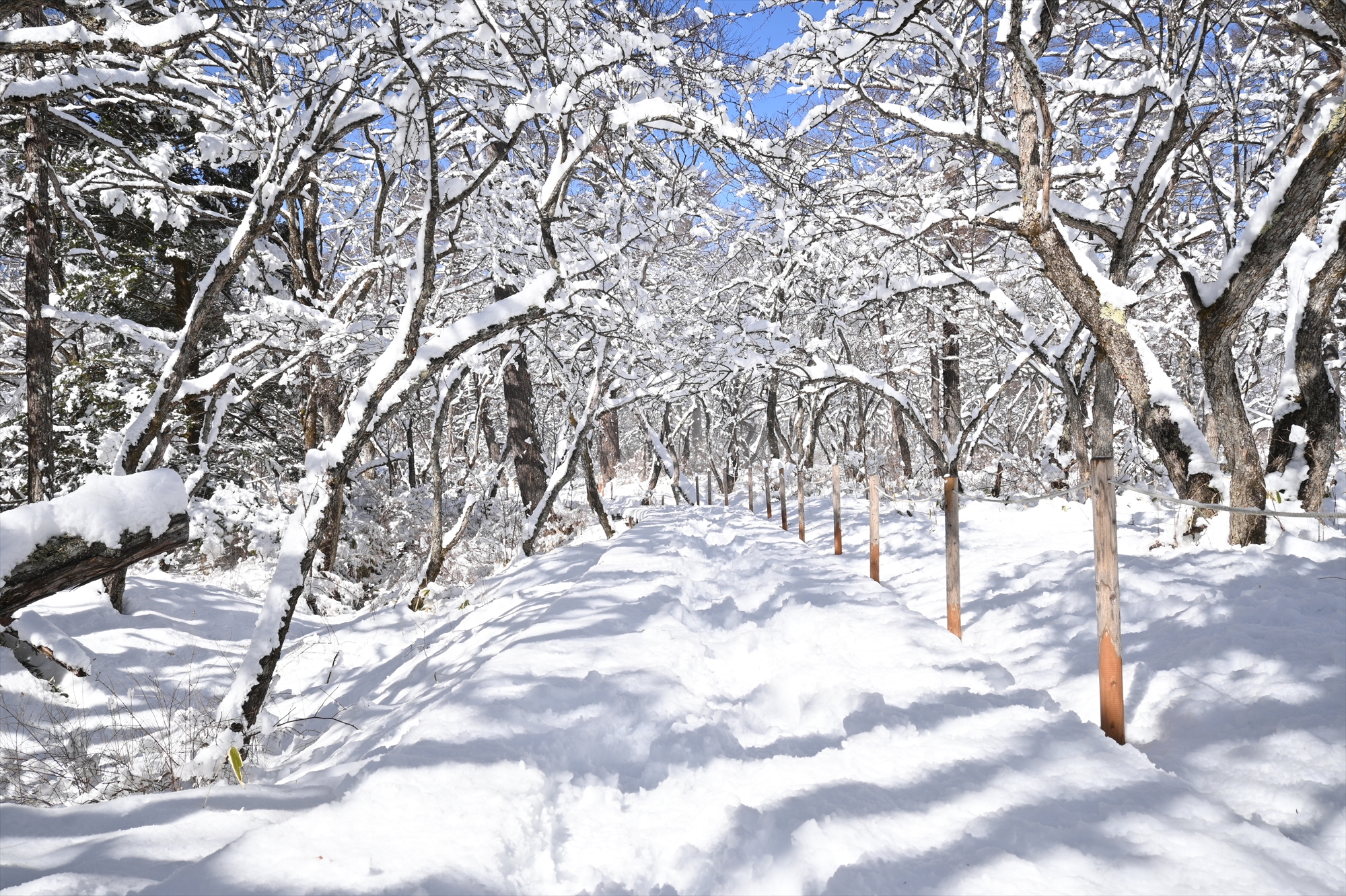 しかし、今回の雪の影響でコース上には20㎝程の積雪があり、日陰では、凍結する可能性があります。歩かれる際はチェーンスパイク等の装備があるといいかもしれません。