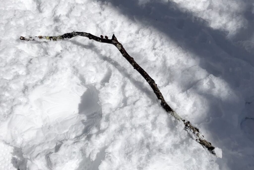 雪の花を楽しみつつ進んでいると雪上に40~50㎝程の細い枝が落ちているのに気が付きました。