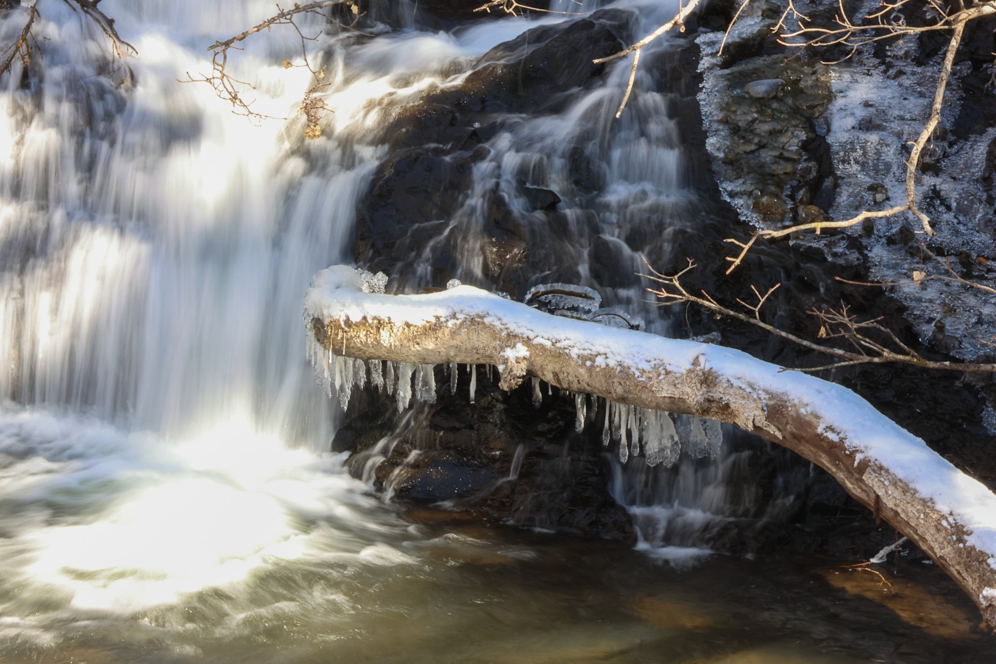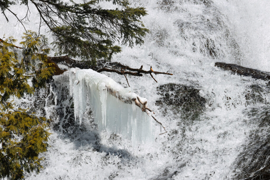 おそらく滝の水しぶきが、周辺の枝や、滝つぼの倒木などにつき、それが繰り返し成長したのだと思います。