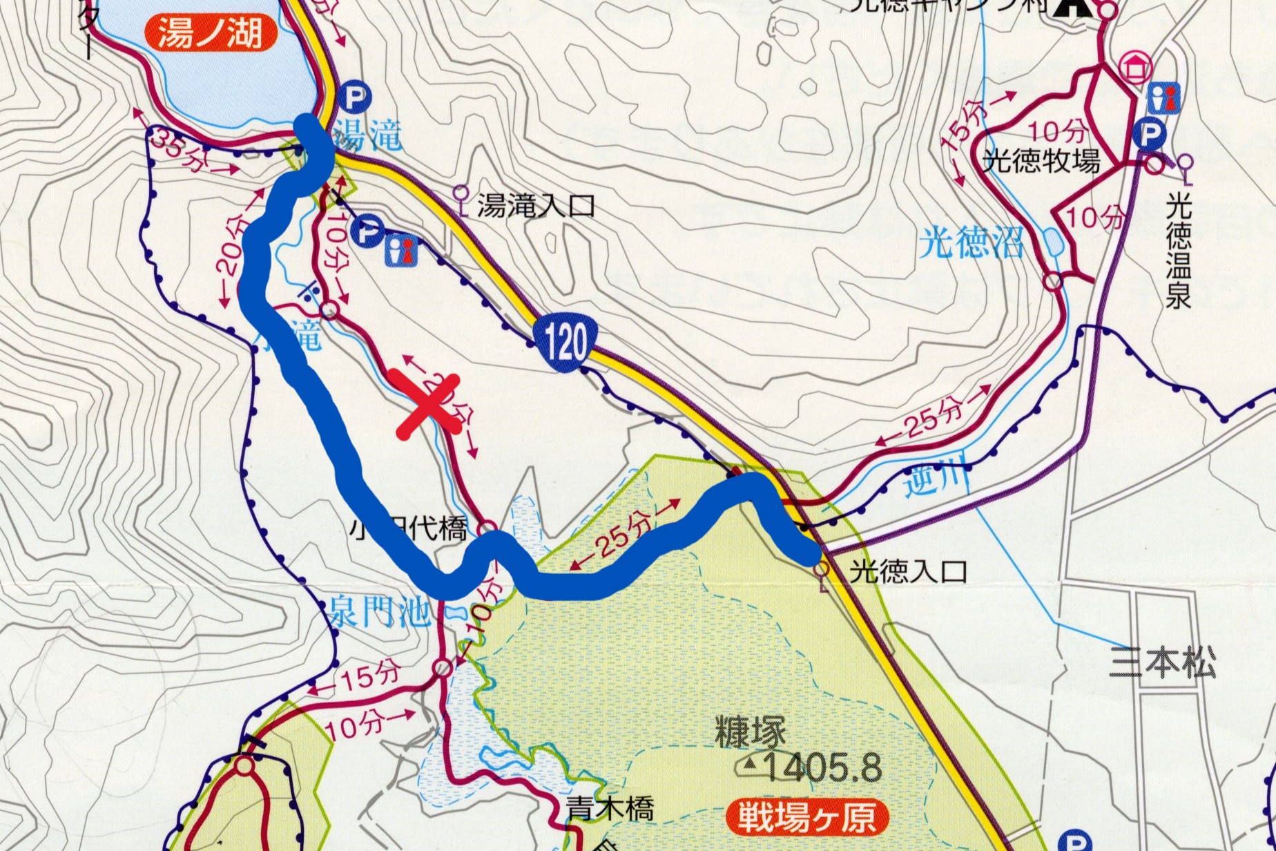 地図上の青い太い線のコースです。 ※×は現在通行止め