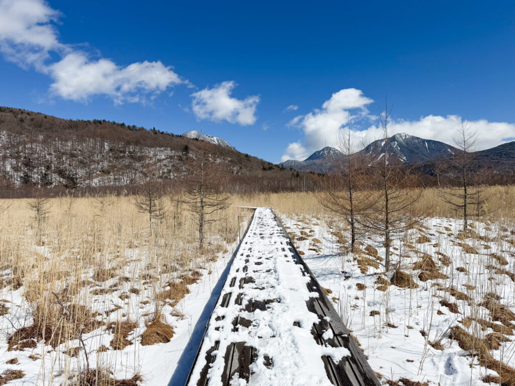 →日陰は木道が見えない箇所もあります。 →日向では雪が解けて、滑りやすいのでお気を付けください。