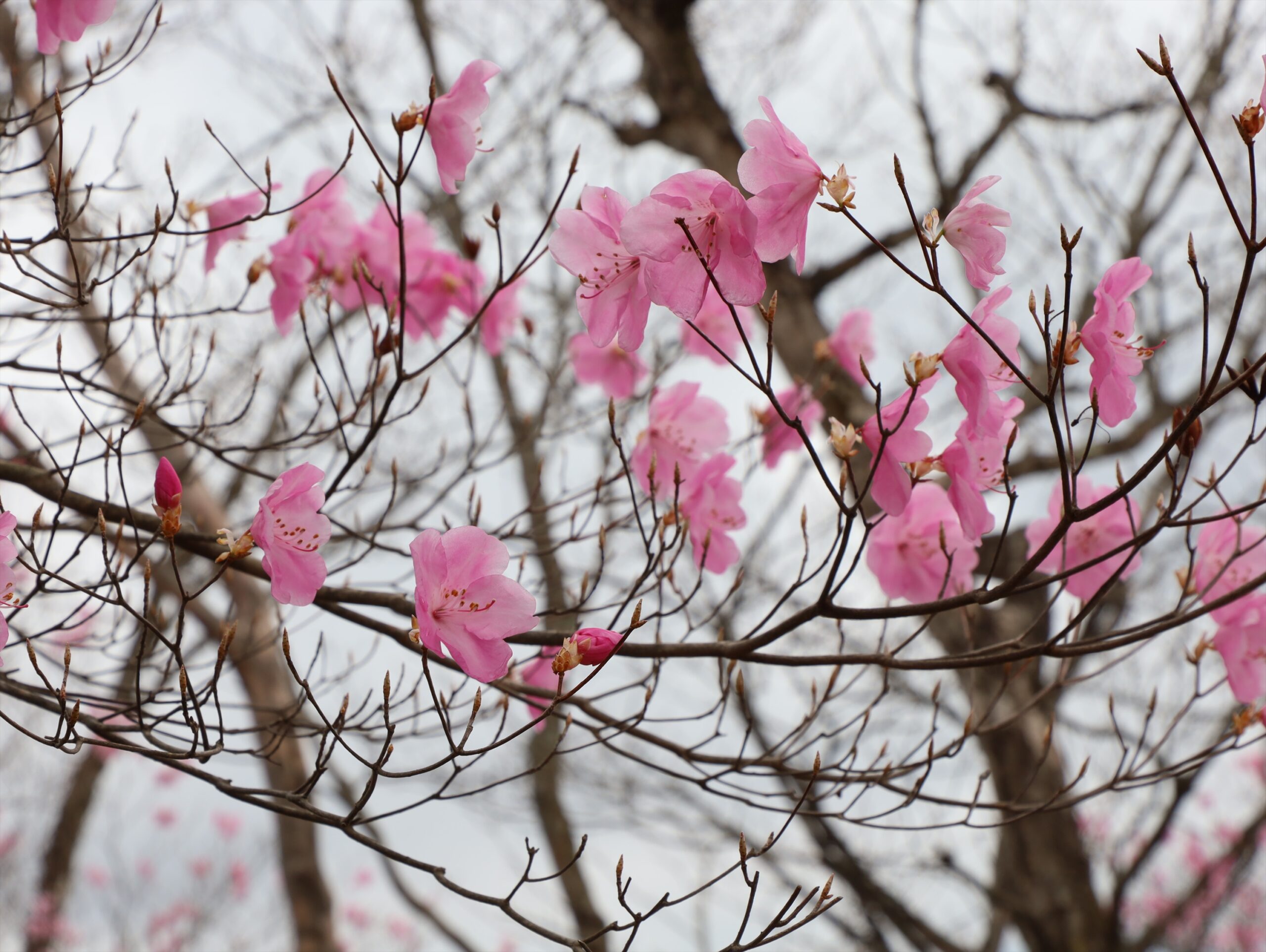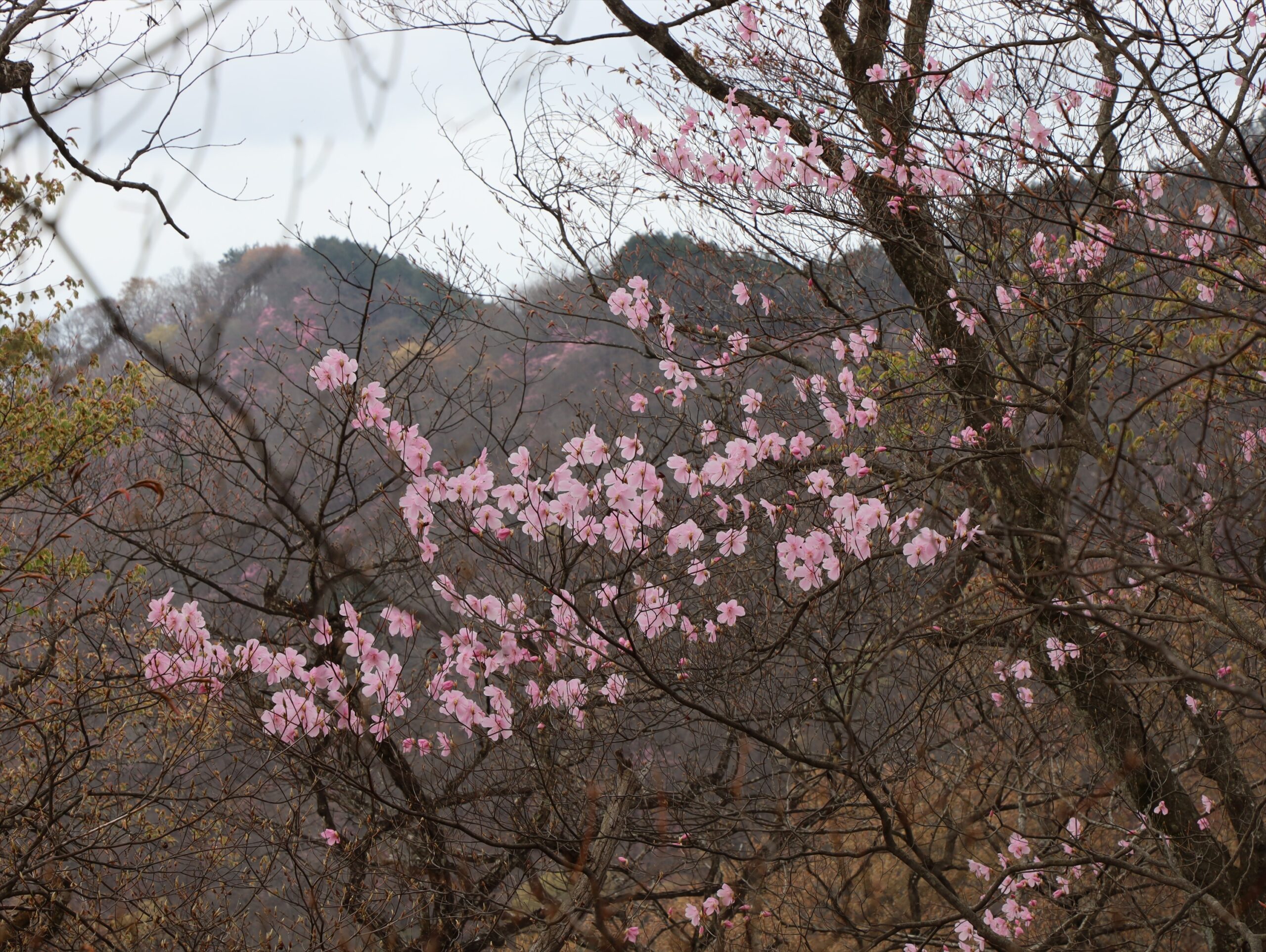 アカヤシオは2~4mほどの低木で、葉が芽吹く前に直径5センチほどの目立つピンク色の花を付けます。
