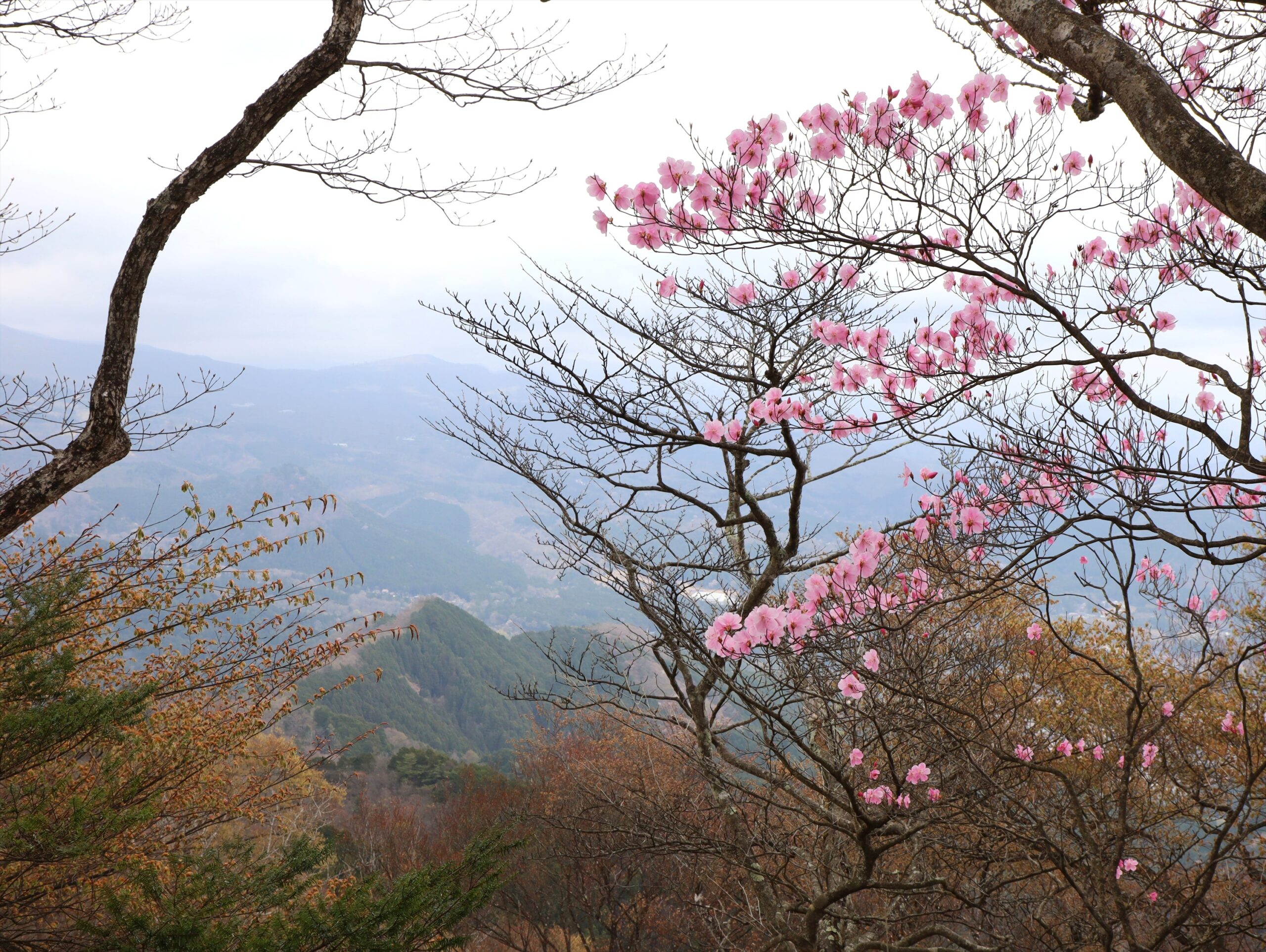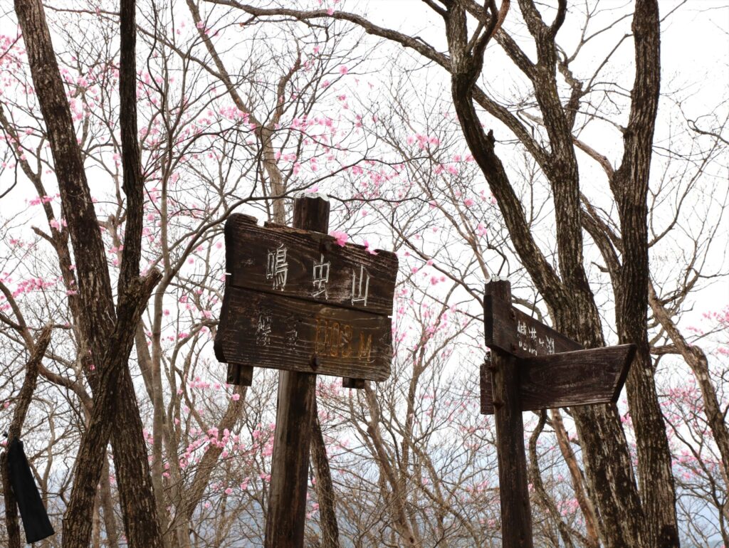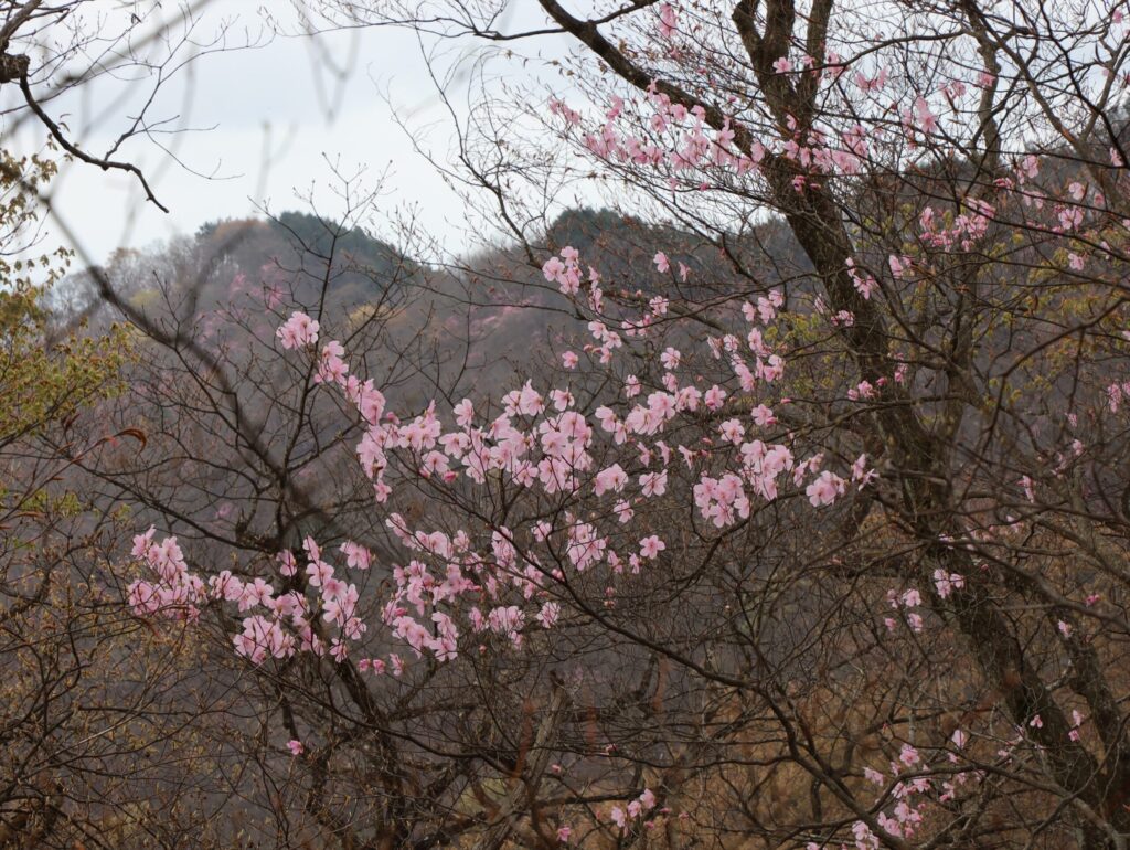 山頂付近から眺めた山肌ではアカヤシオのピンクとブナを始めとする木々の新芽の淡い色が美しい景色を作り出しており、つい足を止めて浸ってしまうような美しさでした。