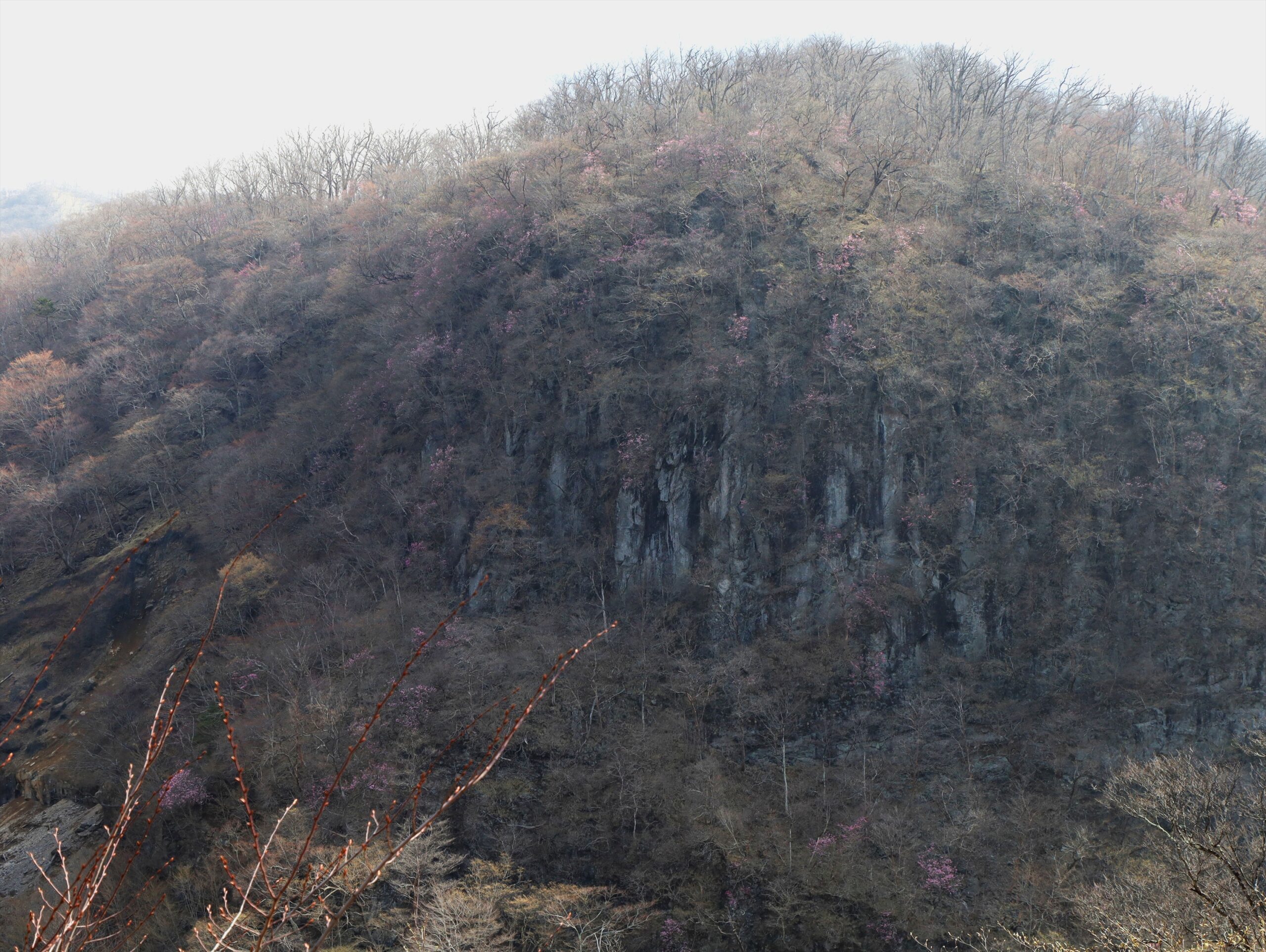 下りいろは坂の剣が峰から正面に見える岩壁でもアカヤシオが開花していました!!