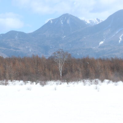春の暖かさの中、雪景色の戦場ヶ原