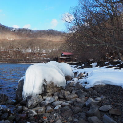 中禅寺湖の畔を通る道路のすぐ下にある中禅寺湖周遊歩道、この歩道沿いの浜はしぶき氷を見るのに適したポイントです。この歩道を、中禅寺湖畔ボートハウスから中禅寺温泉街方面に歩くと・・・ あちこちで…